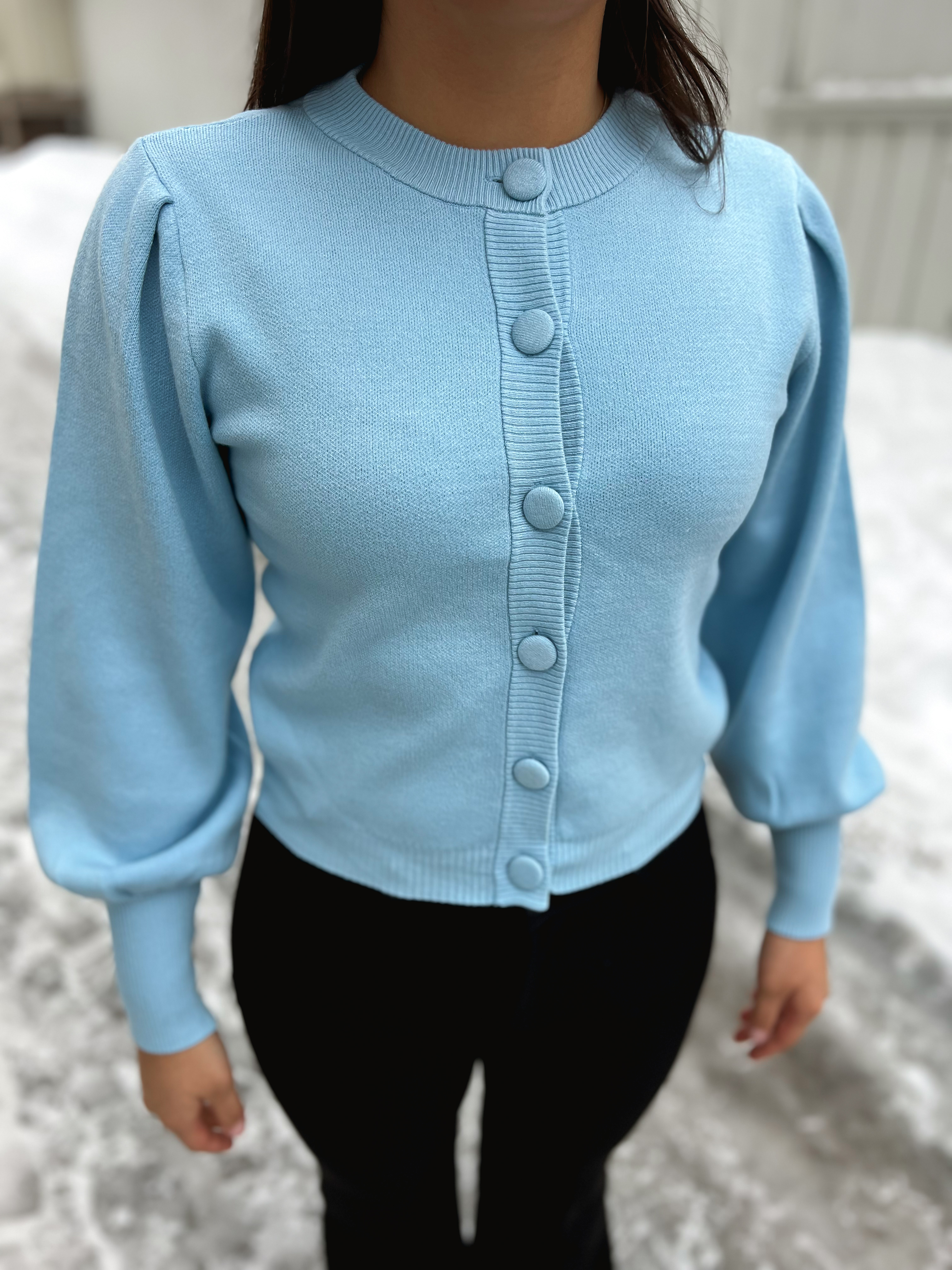 «Finne knit cardigan» fra YAS. Nydelig cardigan i fargen «clear sky». Den har rund hals, store ermer med puffeffekt og lukkes med knapper.