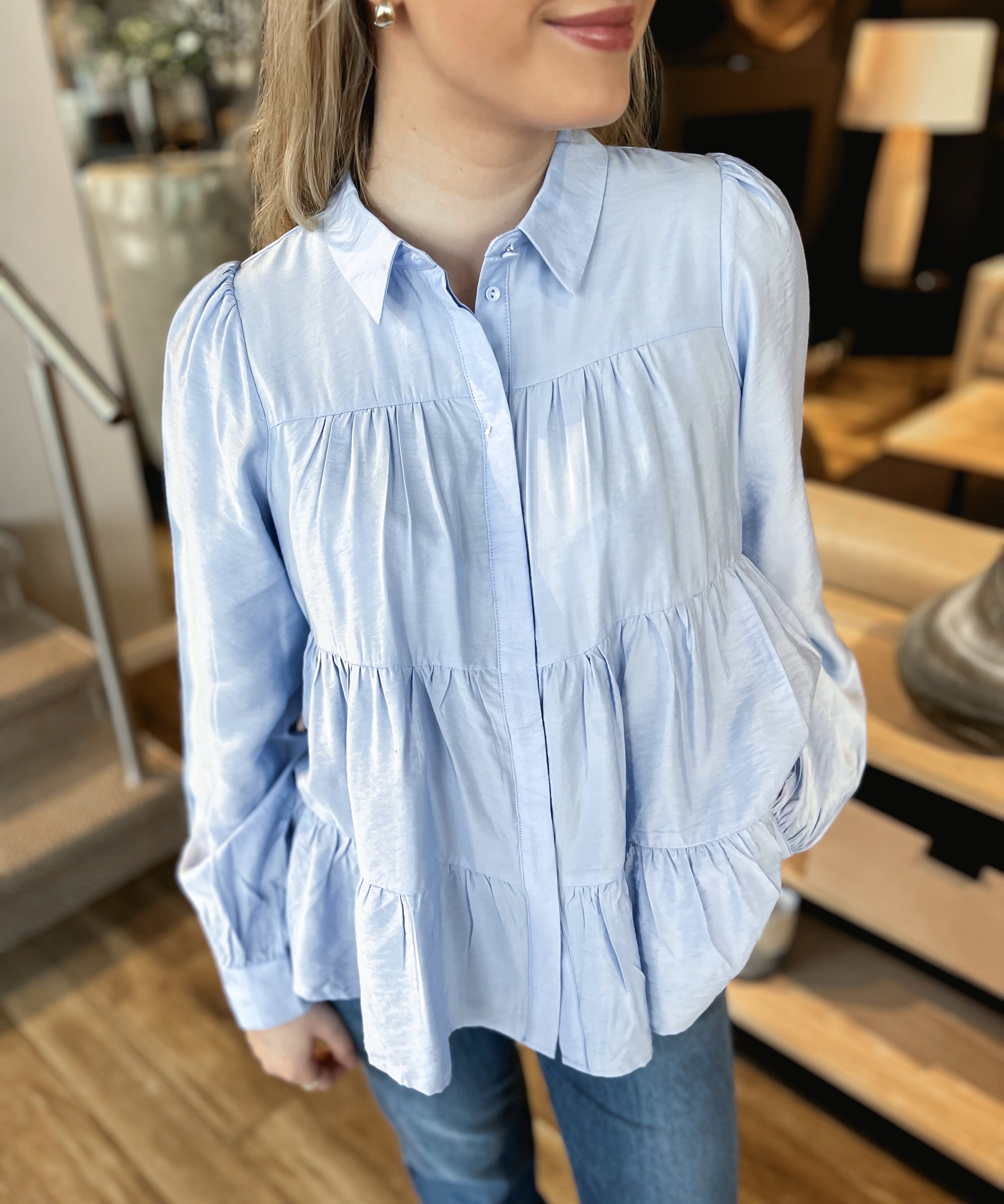 «Pala shirt» fra Yas er en søt skjorte med volang detaljer. Skjorten har krage, lang erm og lukkes med knapper. Løs passform og normal i størrelsen.