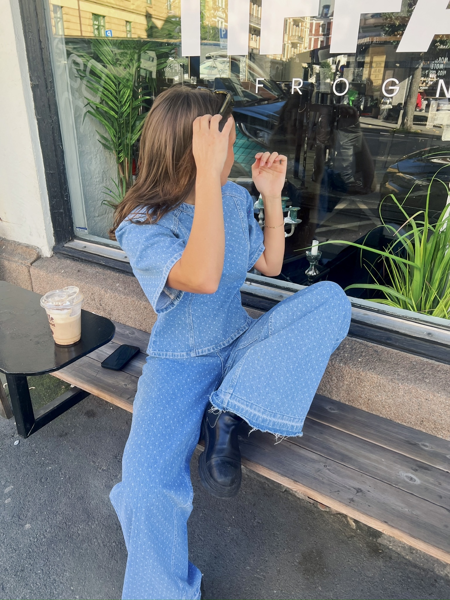 «Stella» fra Custommade. Nydelig denim topp med hvite «dots». Toppen har rund hals og store korte puffermer. Lukkes med en knapp og liten åpning detalj bak nakken. Toppen er tettsittende i fasongen. Passer perfekt sammen med «Oteca buksen».