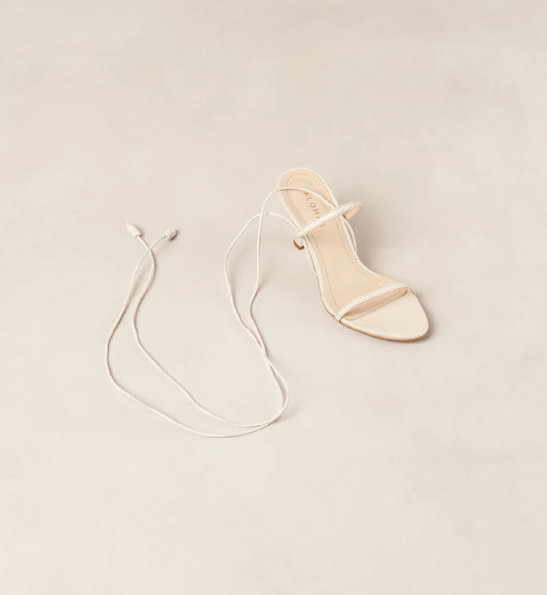 Kendra Leather Sandals fra ALOHAS. Kule sandaler fra ALOHAS i kremfarget skinn - en av våre favoritter denne sesongen! Kendra Leather Sandals har en skråstilt stiletthæl, smale stropper over foten. Dekorativ snøredetalj rundt anklene.