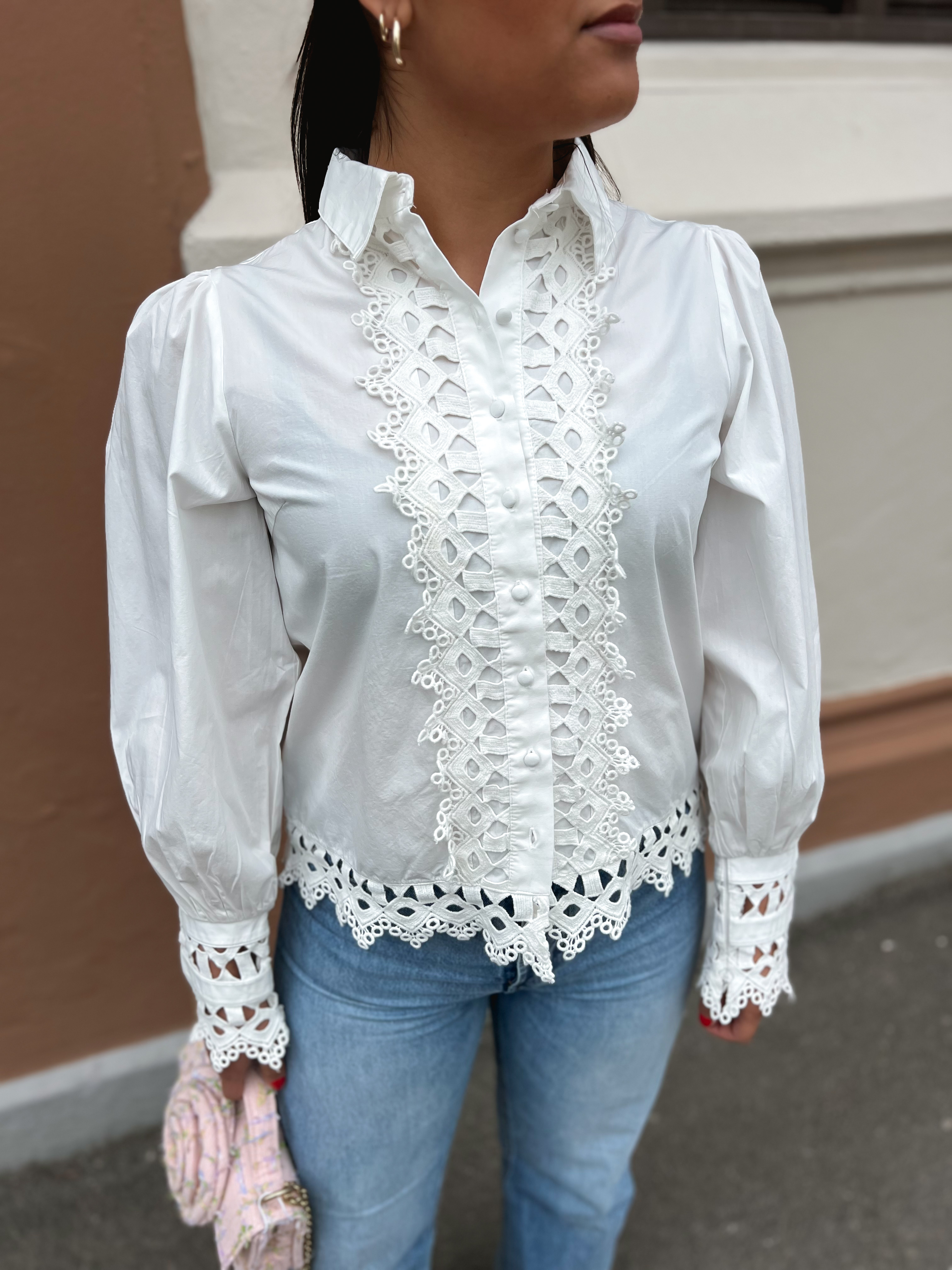 «Trima shirt» fra Selected Femme. Nydelig skjorte med rund hals og lang erm. Vakre engelske blonde detaljer.