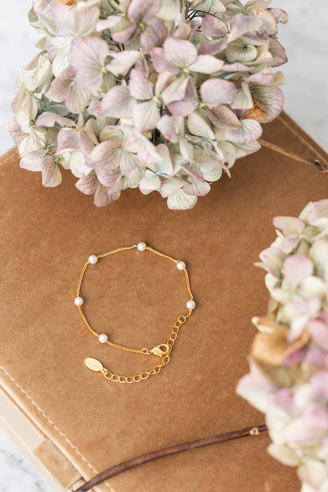 Tidløst og vakkert armbånd i glossy gold med nydelige hvite swarovskiperler. Passer like bra til hverdags som til fest!