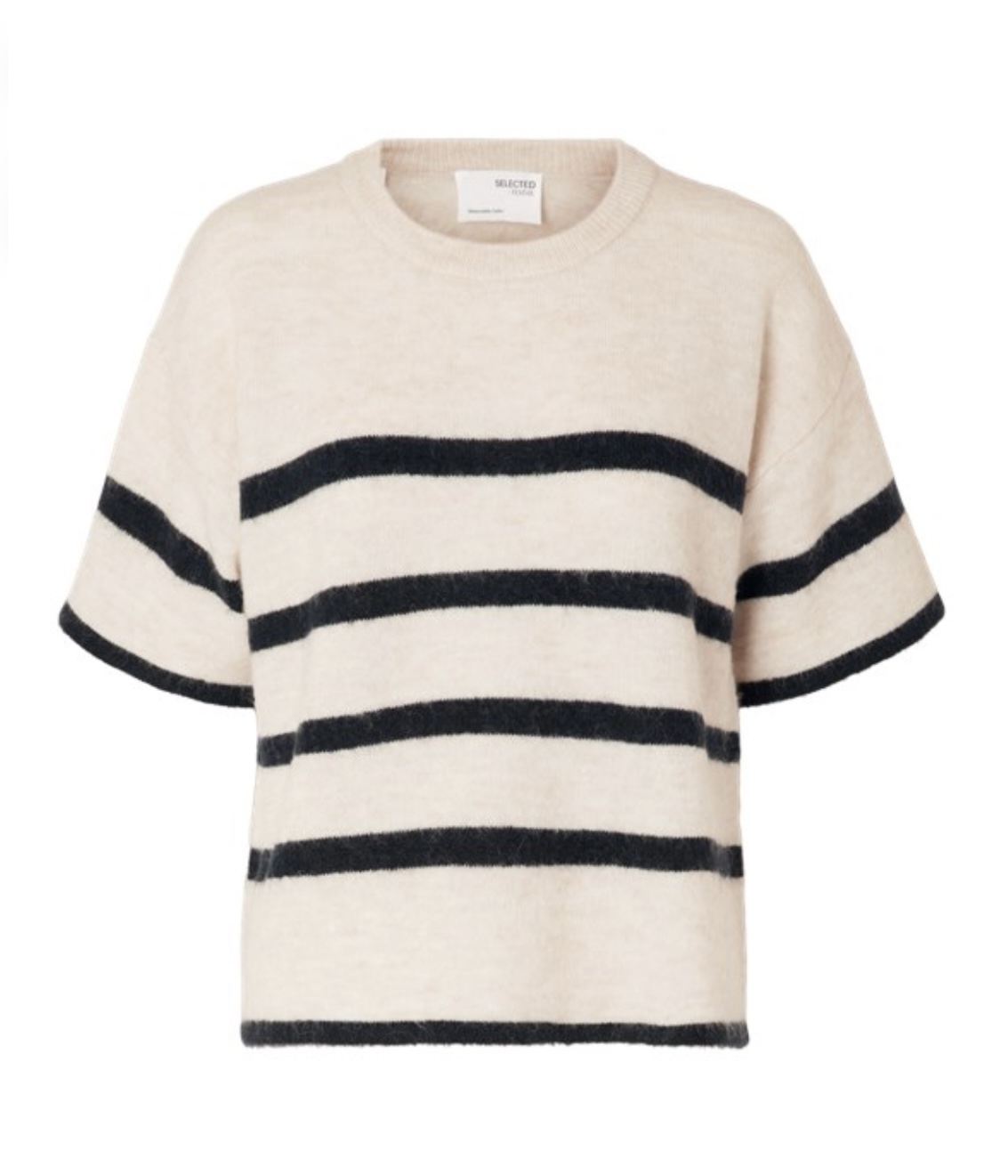 «Maline-Liliana 2/4 knit o-neck» fra Selected Femme. Herlig strikkegenser i avslappet passform med rund hals og kort erm.