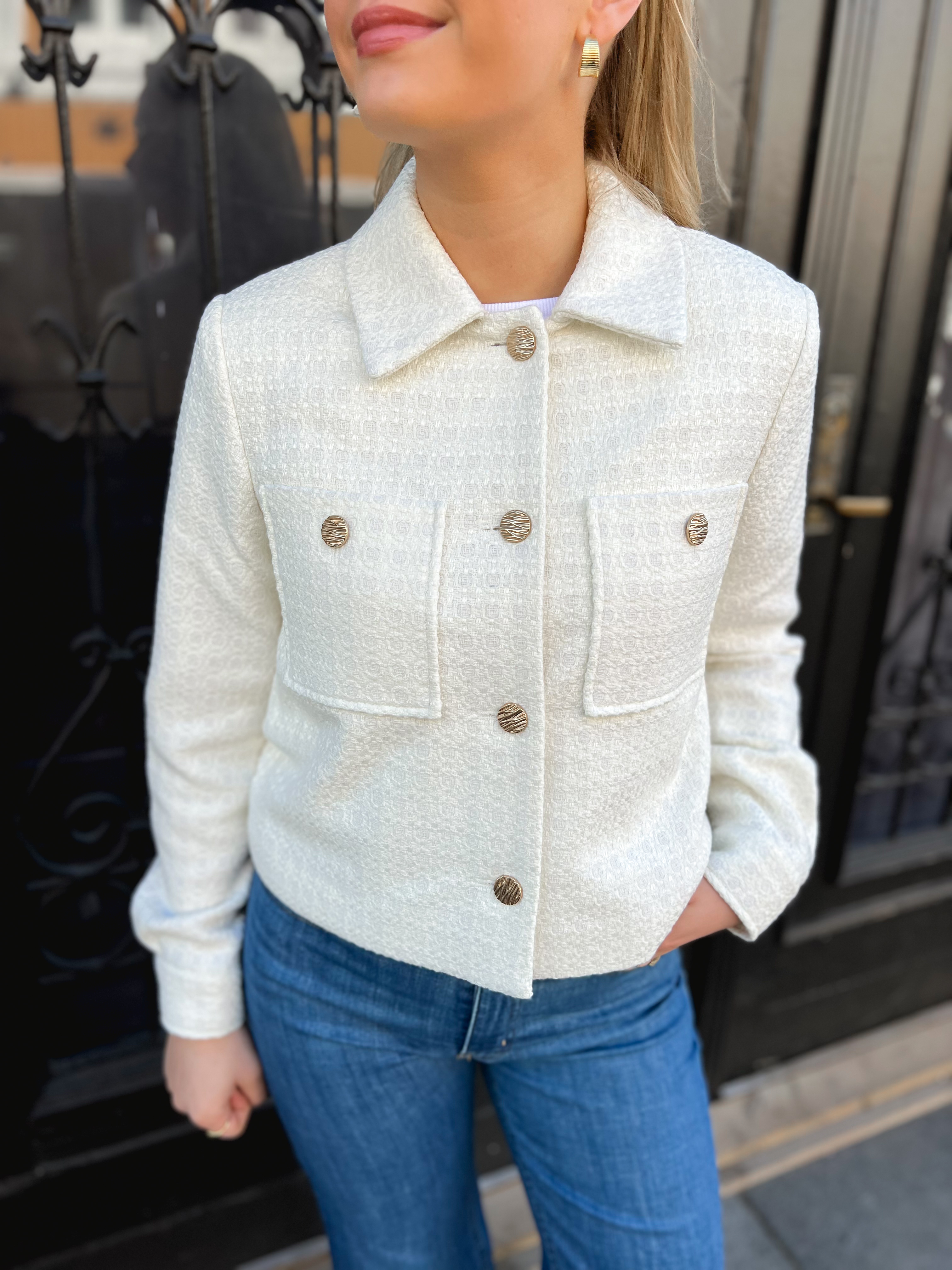 «Snow jacket» fra YAS. Nydelig tweedjakke i fargen «Birch» med lekre knapper med gulldetaljer. Tweedjakken passer perfekt til alle vårens antrekk.