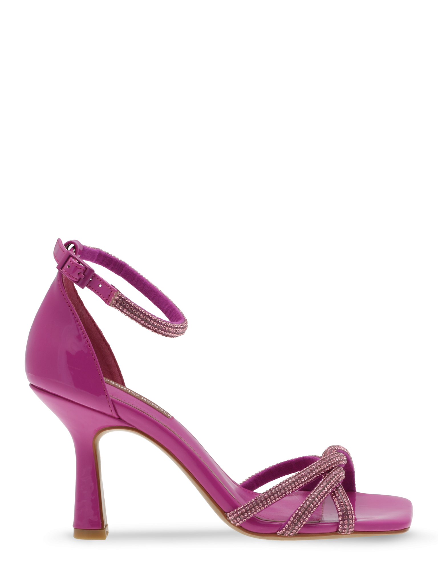 "Fiola" er en statement pump med smale stropper over vristen og ankelrem med spennelukking. Stroppene er besatt med skinnende strassdetaljer i matchende farge og har myk, børstet mikrofiberpolstring på undersiden. Overdel i imitert skinn med lakkeffekt.