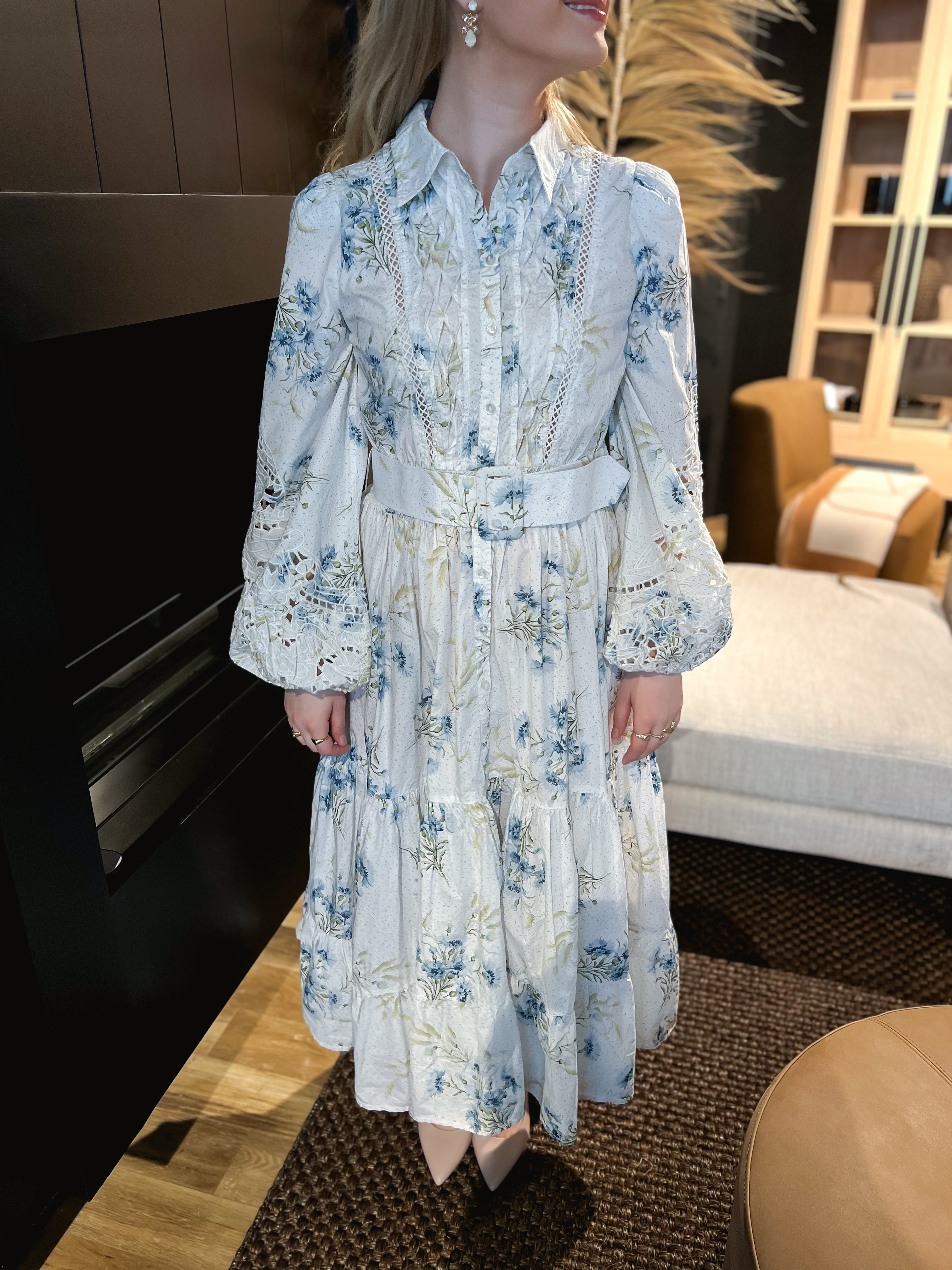 Poplin Midi Dress fra by TiMo er en vakker kjole i en myk og crisp GOTS-sertifisert bomullskvalitet. Den har en midi-lengde, voluminøs skjørt og trekvart lengde voluminøse ermer med elastiske mansjetter. Kjolen har en skjortekrage med knapper foran. Den har en tilpasset, smal midje laget av rynker. Ermene foran og bak kjolen har fine broderie anglaise-innlegg.