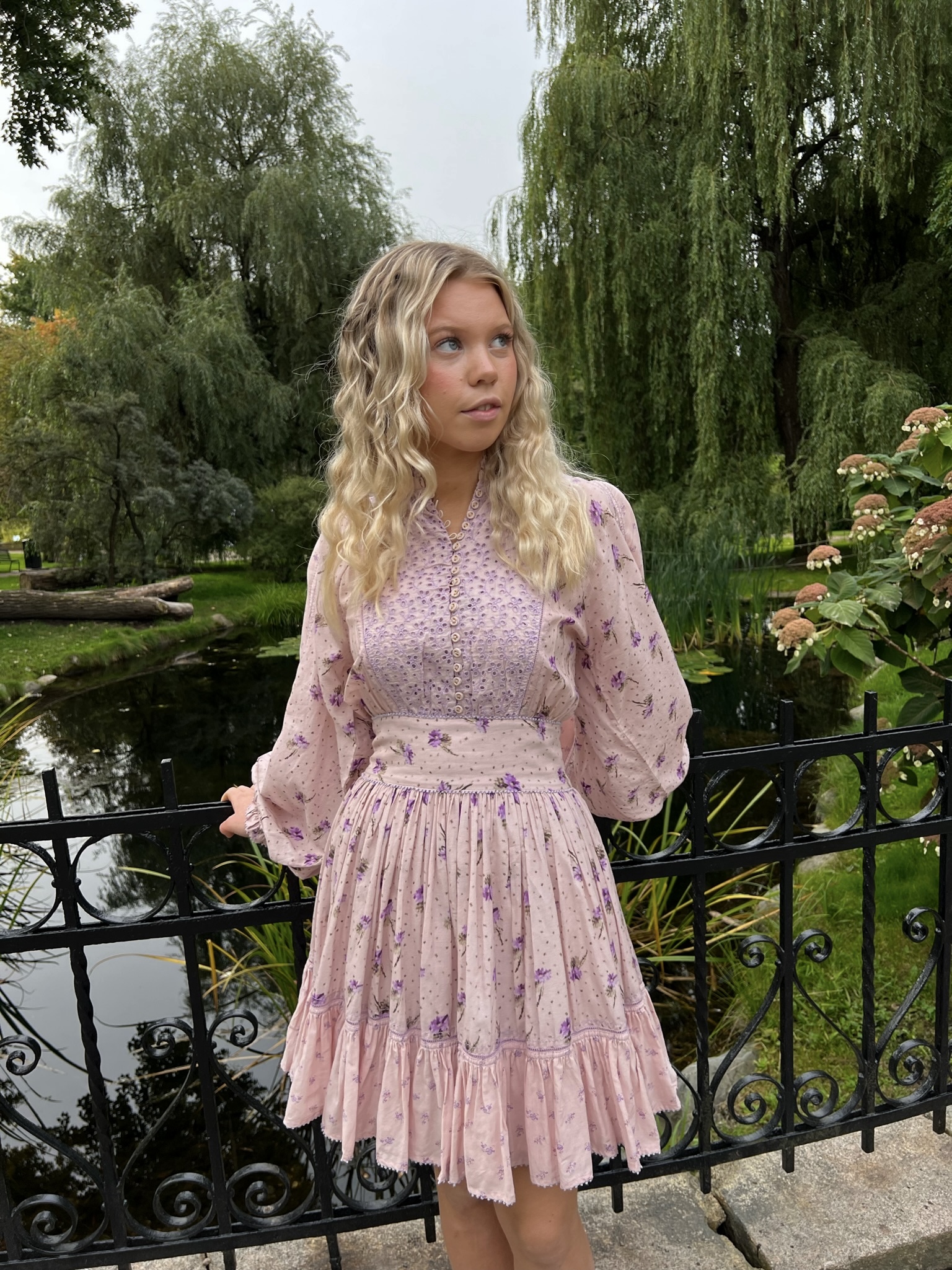 «Patchwork puffed dress» fra byTiMo er en vakker blondekjole i en tynn og lett bomullskvalitet. Kjolemodellen er kort og har et bredt belte i midjen med strikk bak. Ermene er oversized. Det er engelske blondedetaljer på ermene og på overdelen av kjolen. Underskjørtet er fôret. Lukkes med skjult glidelås på ene siden.