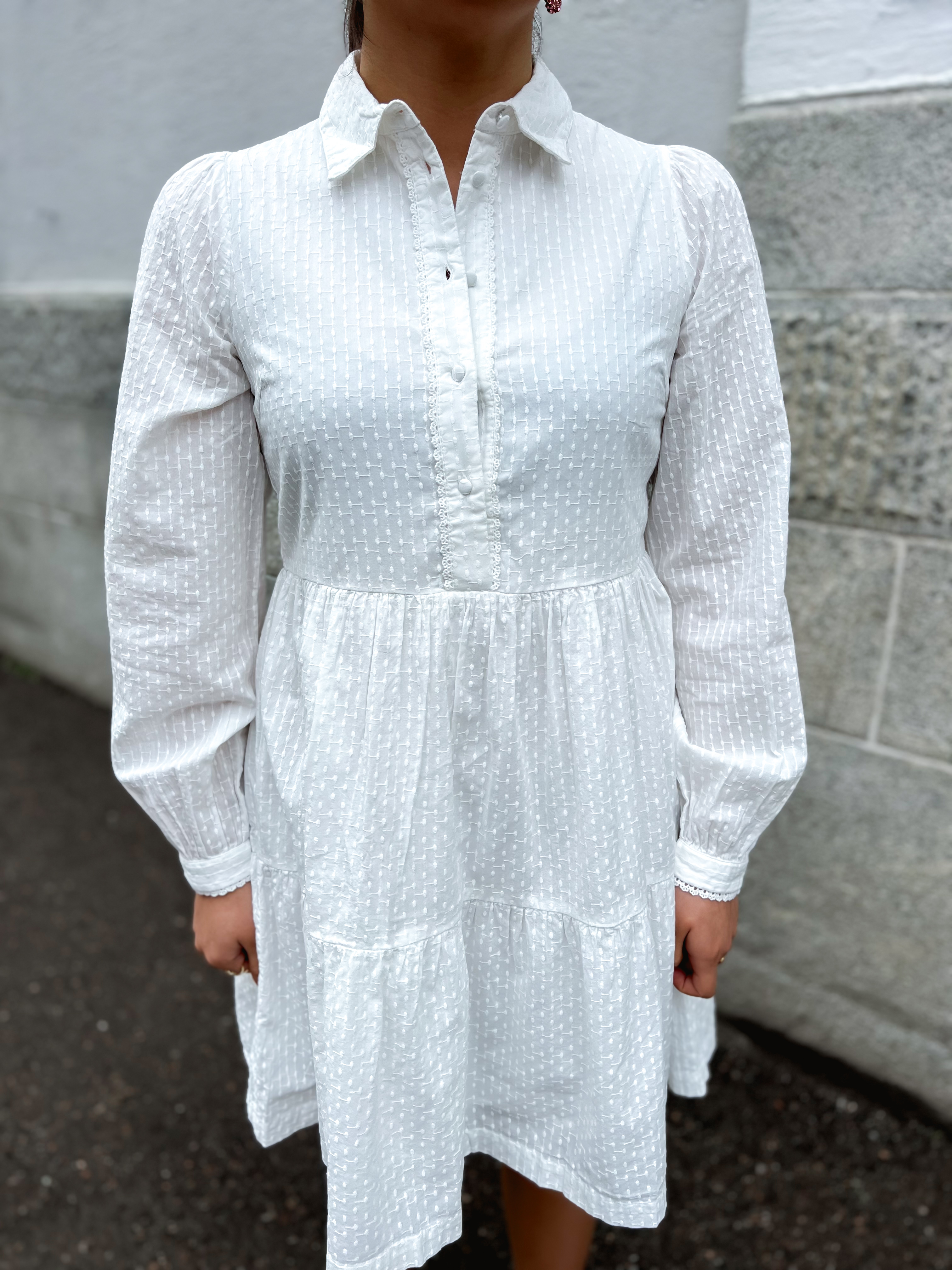 «Tia dress» fra YAS. Superfin langermet kjole i klassisk hvit. En kjole som passer til både fest og hverdag, avhengig av hvordan du styler den. Bruk med høye støvletter og en cardigan på jobb, eller med et par lekre hæler og skinnende ørepynt - og du er klar for fest!