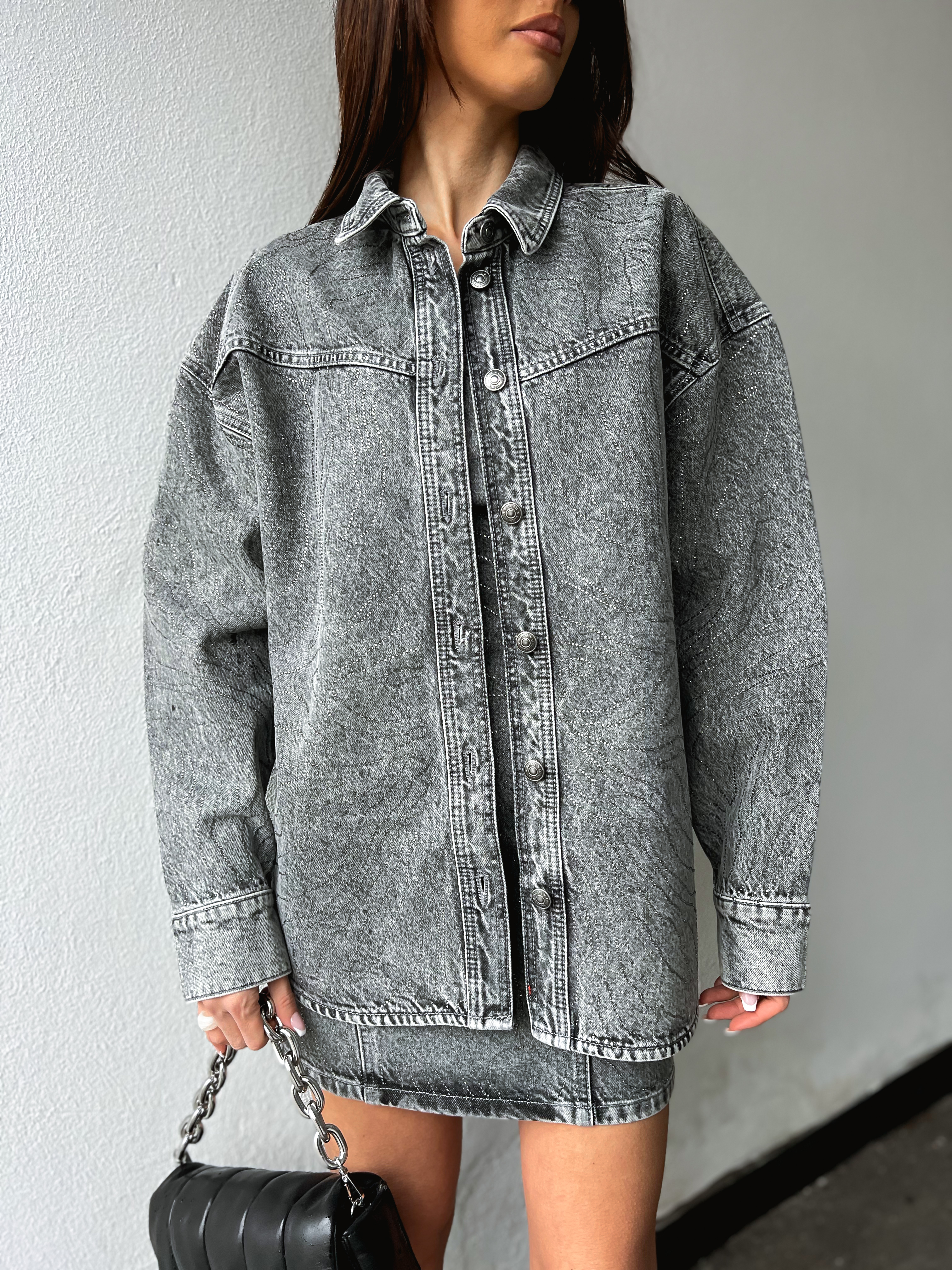 «Rhinestone denim shirt» fra ROTATE er en råkul, oversized denimskjorte i grå denim med små, glitrende stener. Den har en oversized, avslappet passform som understrekes av de senkede skuldersømmene. Skjorten har lange ermer, knappelukking og krage. Vi digger den oversizede passformen og den kule kontrasten til de små, glitrende stenene.