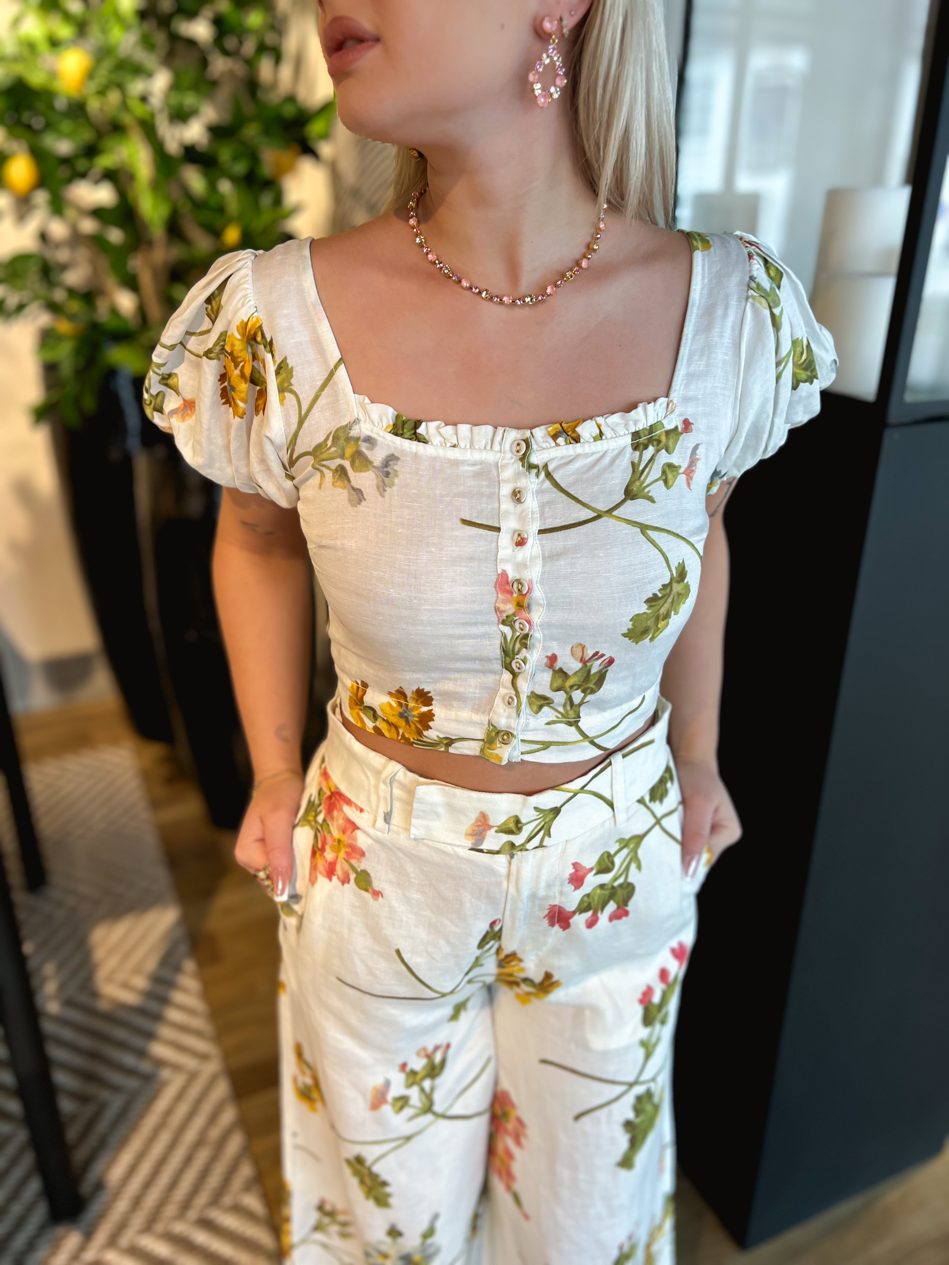 «Linen cropped top» fra byTiMo. Den korte lin-toppen er laget av kvalitetssertifisert lin og viskose. Toppen er kort, har en tettsittende silhuett og er smocket bak. Den har korte, puffede ermer med elastiske rynkede mansjetter og fine samlinger på skuldrene. Toppen har en firkantet halslinje og stoffkledde knapper nedover foran.