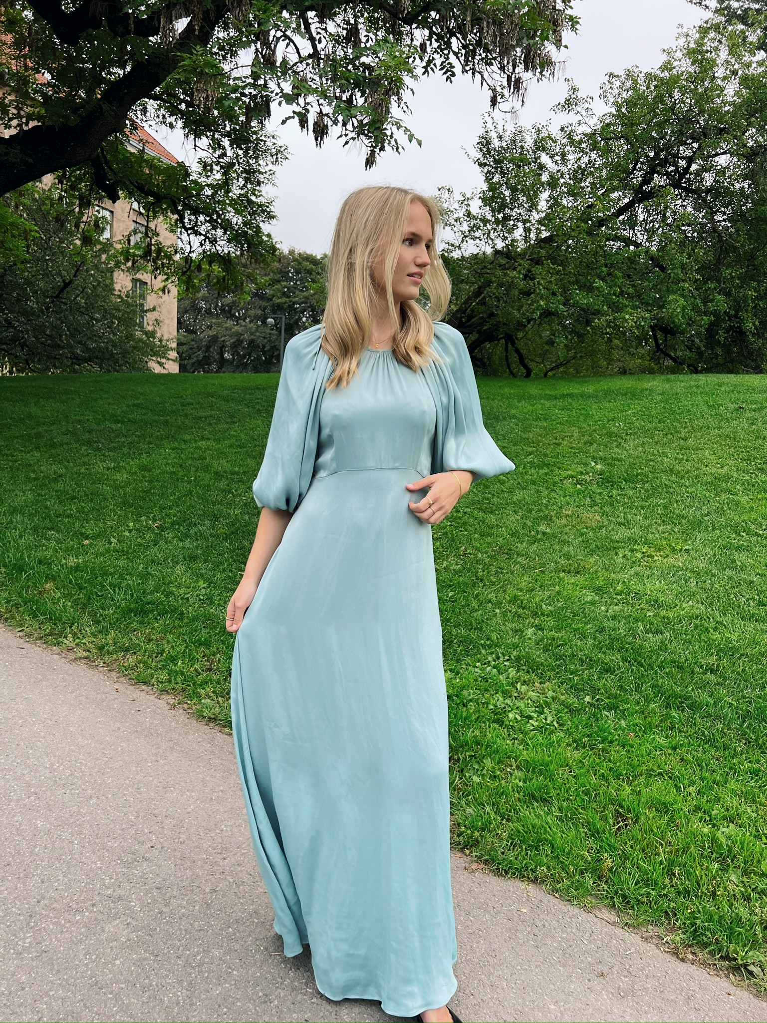 Crepe Satin Maxi dress fra ByTimo føles luksuriøs med blankt stoff som ligner silke. Den er lang og sitter godt i midjen, med trekvart lange, puffete ermer og elastiske mansjetter. Rund hals og åpen rygg med en sløyfe som knytes. Kjolen har fine spalter på toppen og detaljer på skuldrene. Lukkes med glidelås i siden.
