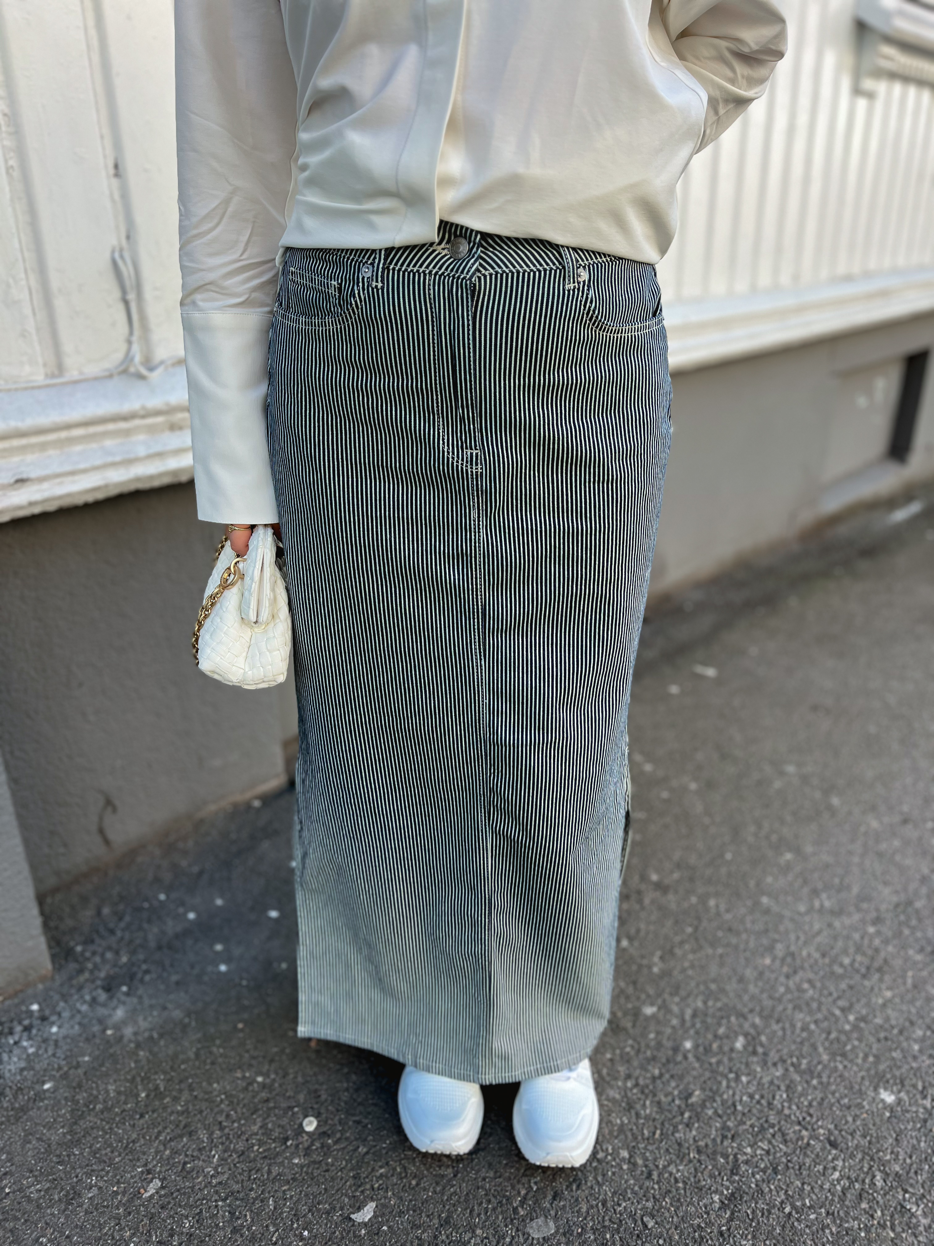 "Myra Stripe denim skirt" fra Selected Femme er et trendy pinstripet denimskjørt, som er middels høyt på livet og splitt i siden. . To lommer på sidene. Skjørtet er i midi-lengde. Normal i størrelsen.