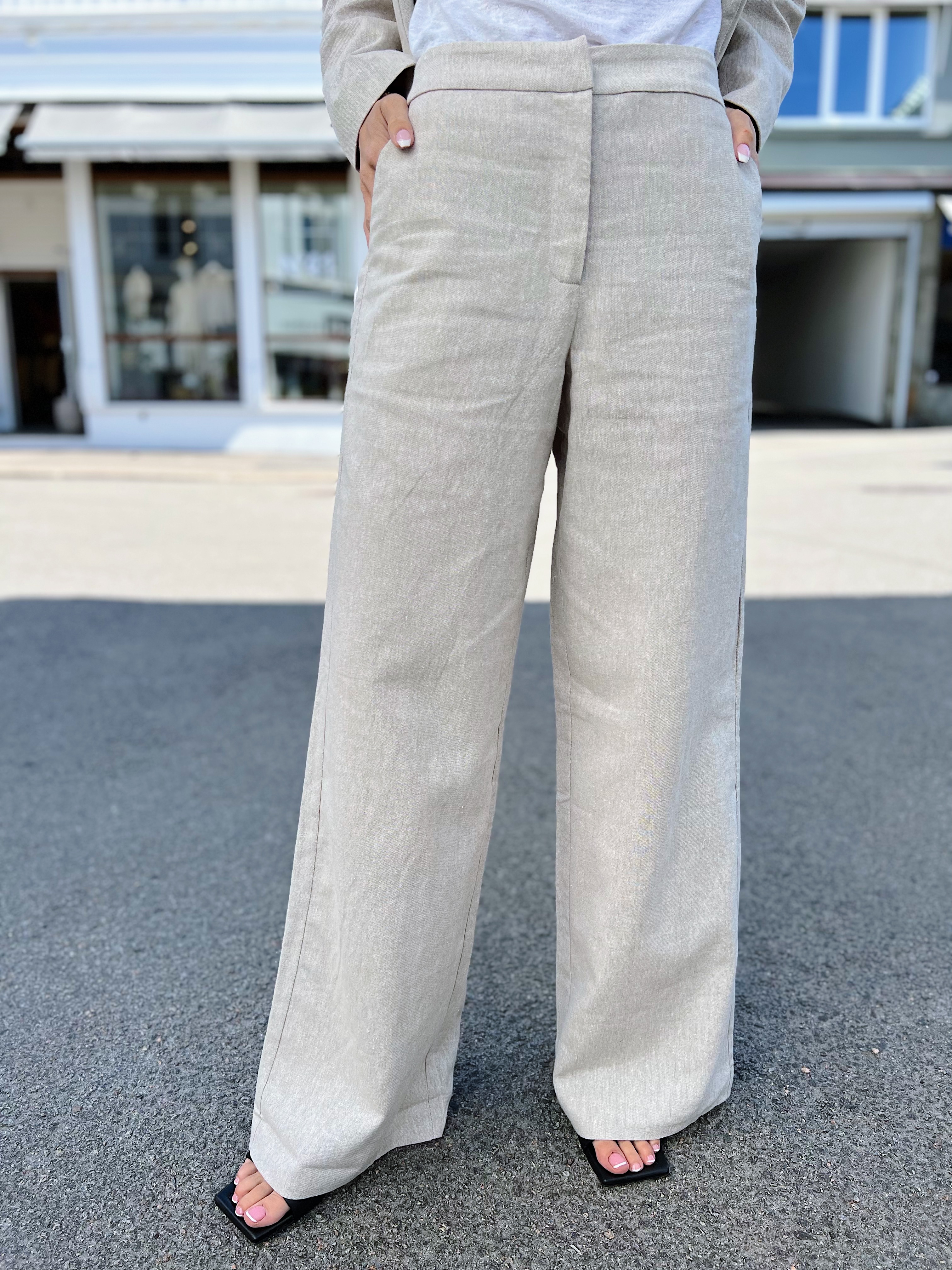 «Tania-eliana wide pant» fra Selected Femme. Elegant dressbukse med vidde ben. Laget i et lett og glatt stoff med linstruktur og viskose. Med knapp, krok og skjult glidelås. To skrå lommer og to dekorative lommer bak. Figursydd midje og brede, rette ben. Matcher perfekt sammen med «Tania slim blazer».