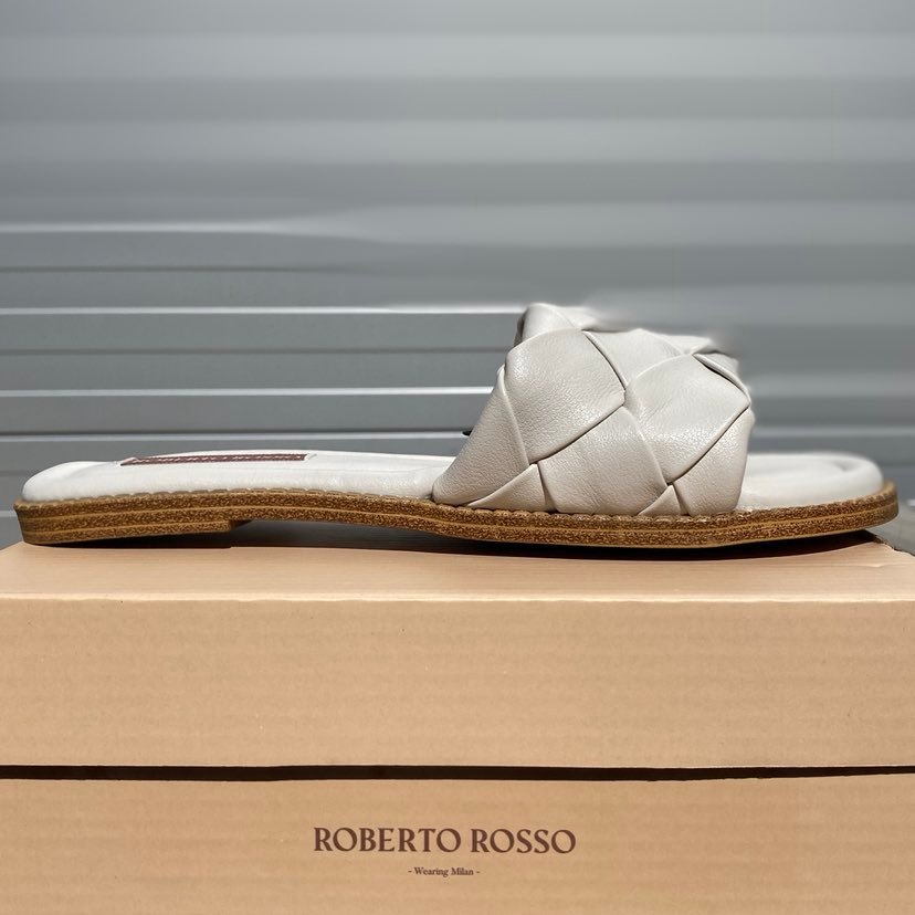 Sandalen har en bred flettet reim over vristen og åpen tå.
