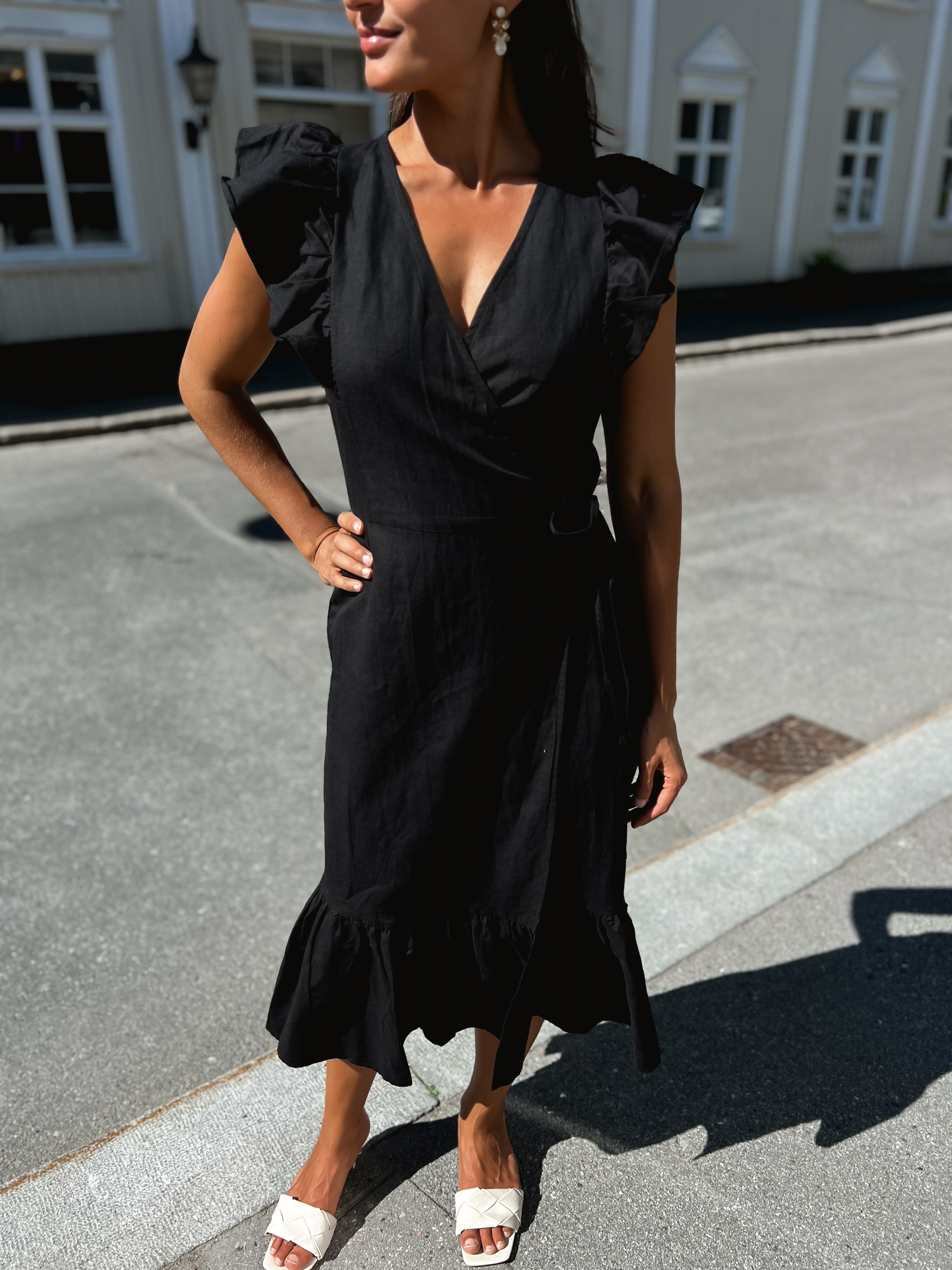 «Valeria dress» fra MISSMAYA. Vakre feminine Valeria-kjole i herlig linblanding. Den har en midi-lengde og den vikler seg rundt midjen og gir deg den perfekte silhuetten. Kjolen har korte ermer med volanger, og skjørtet har volang nederst som gir en fin flyt.