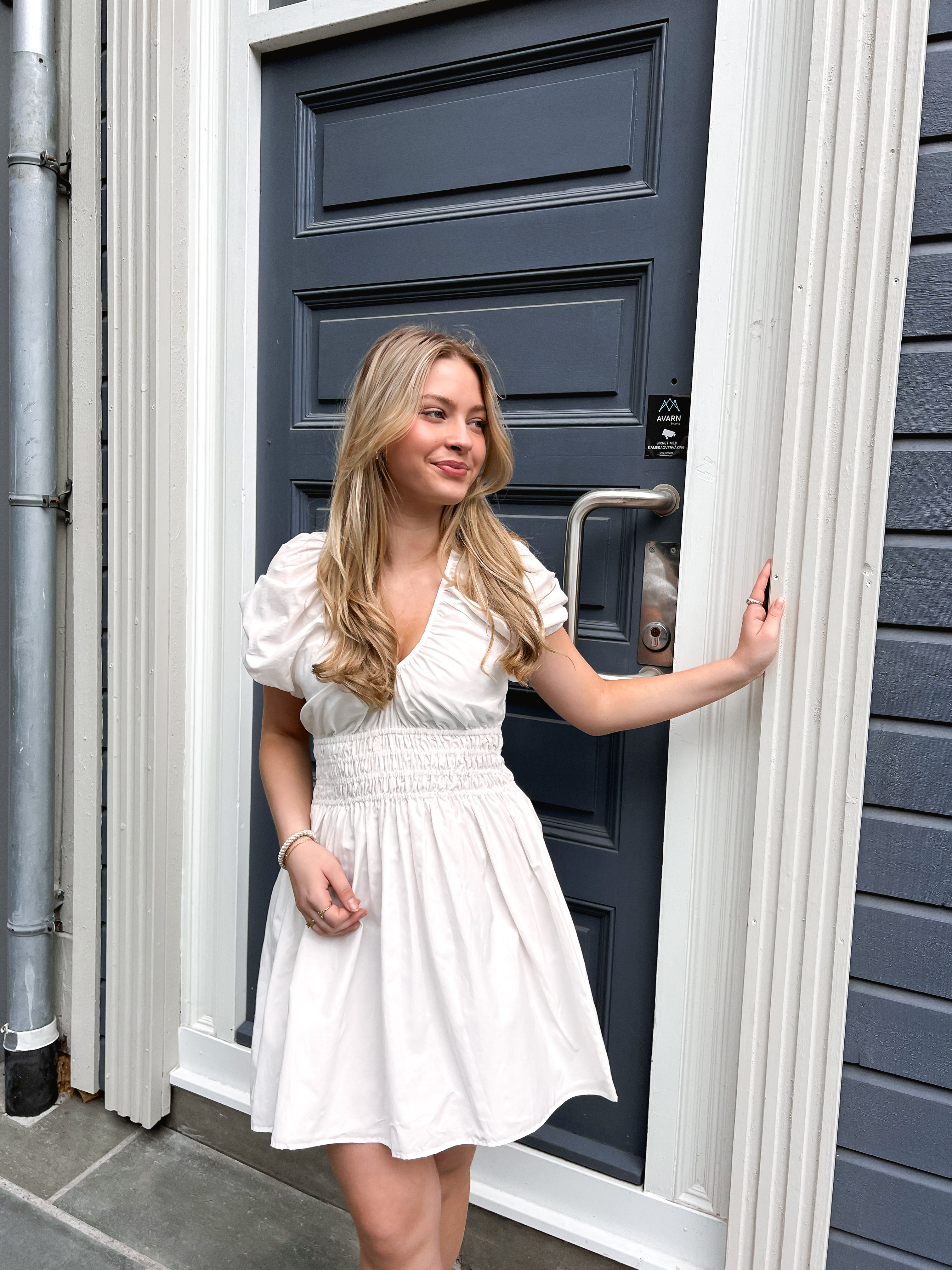 Salone Mini Dress fra Faithfull The Brand. Lekker kjole med en dyp v-hals og korte puffermer for en feminin finish. Den rynkende linningen gir en enkel passform. A-linjet skjørt. Uforet.