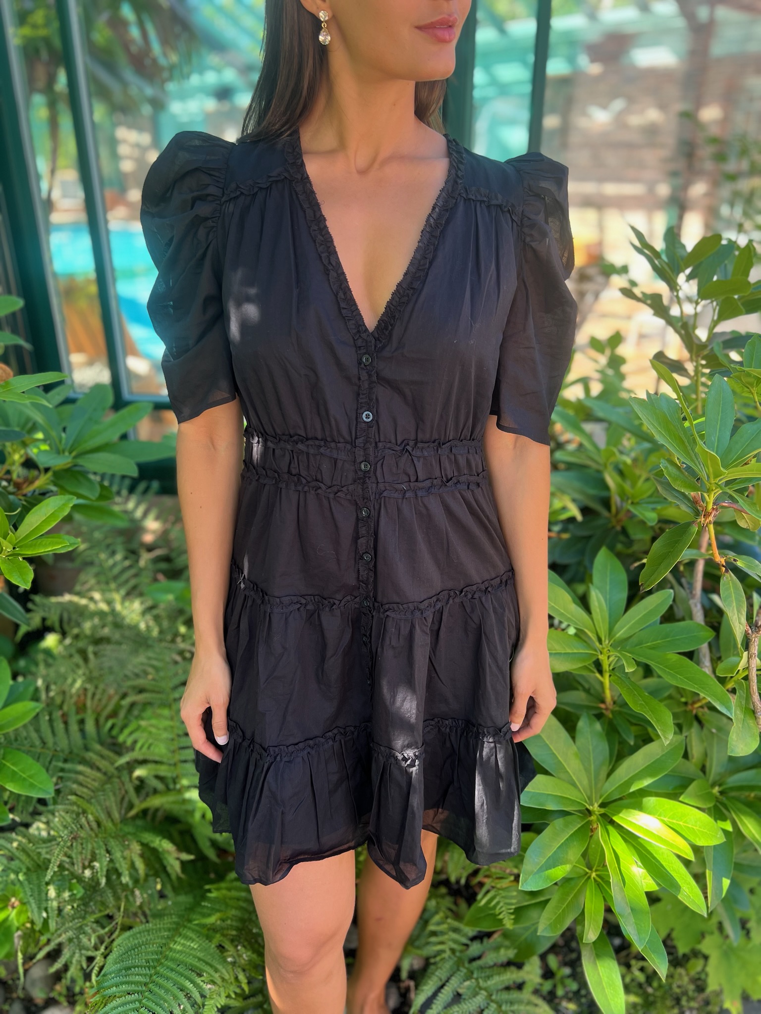 «Jodisa dress» fra Second Female er en søt kjole i sort med minilengde og v-hals i en bomull- og viskoseblanding. Den har korte puffermer, knappelukking og fine blondeborder.