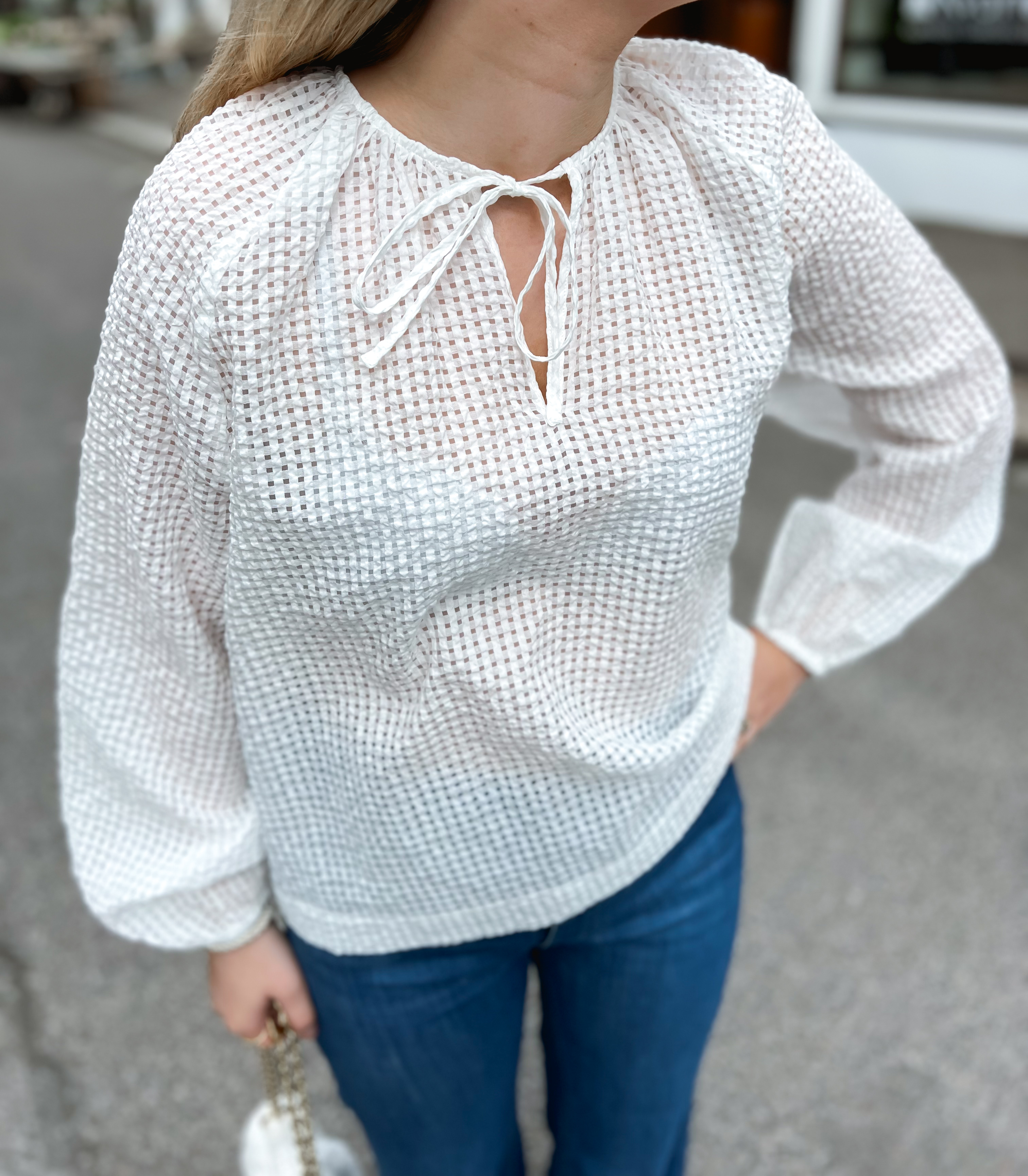 «Tascha blouse» fra Second Female. Nydelig bluse som er laget i en lett bomullsblanding med struktur og rutete mønster. Med rund hals med åpen front og knytefeste i halsen. Lett oppblåste skuldre og avkortede ermer med elastiske mansjetter. Rett nederkant. Avslappet, bred passform.