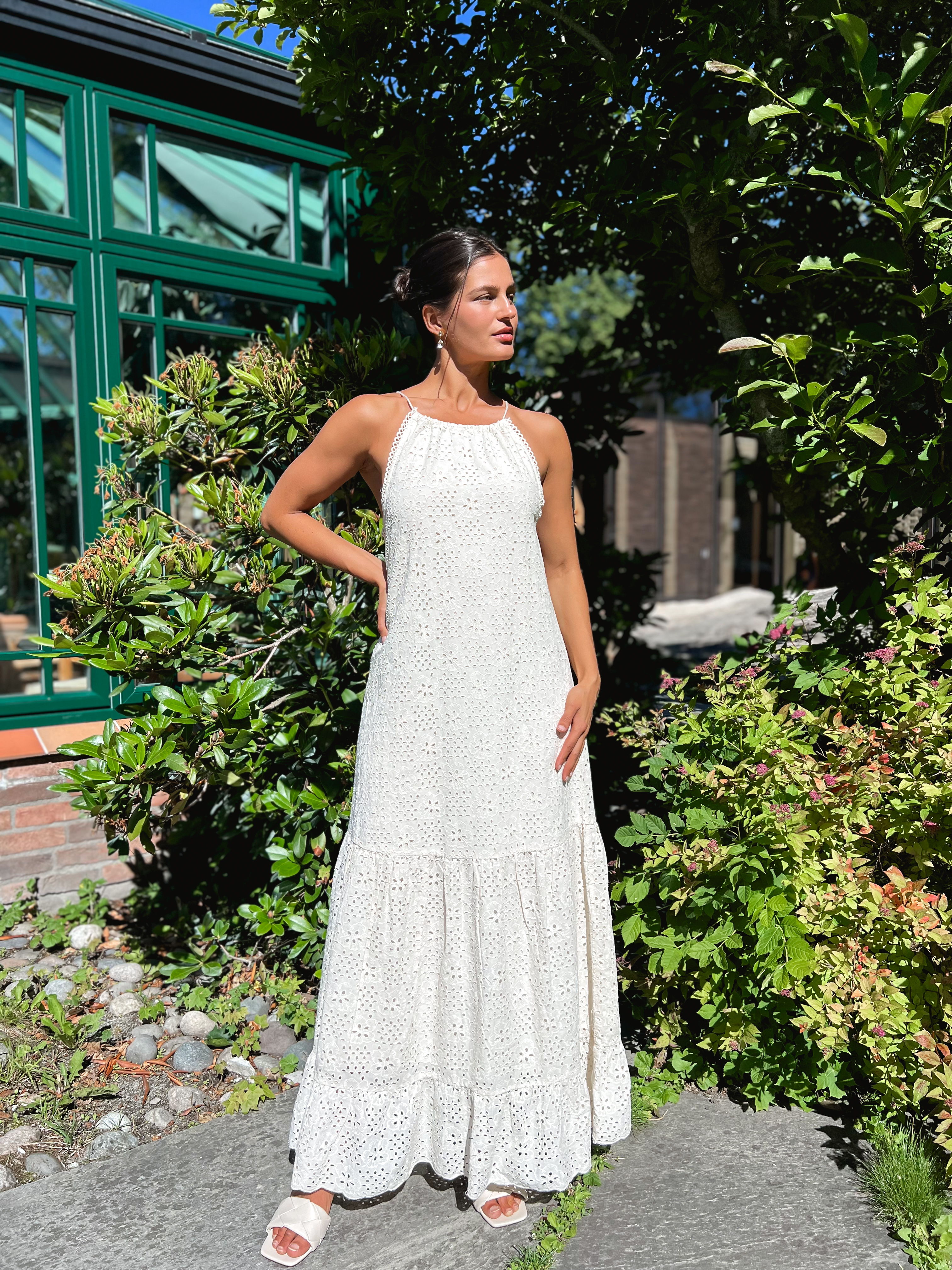 «Milia maxi dress» fra YAS. Nydelig maxi-kjole med engelske blonder. Kjolen har rund hals og stropper. Lukkes med knyting bak.