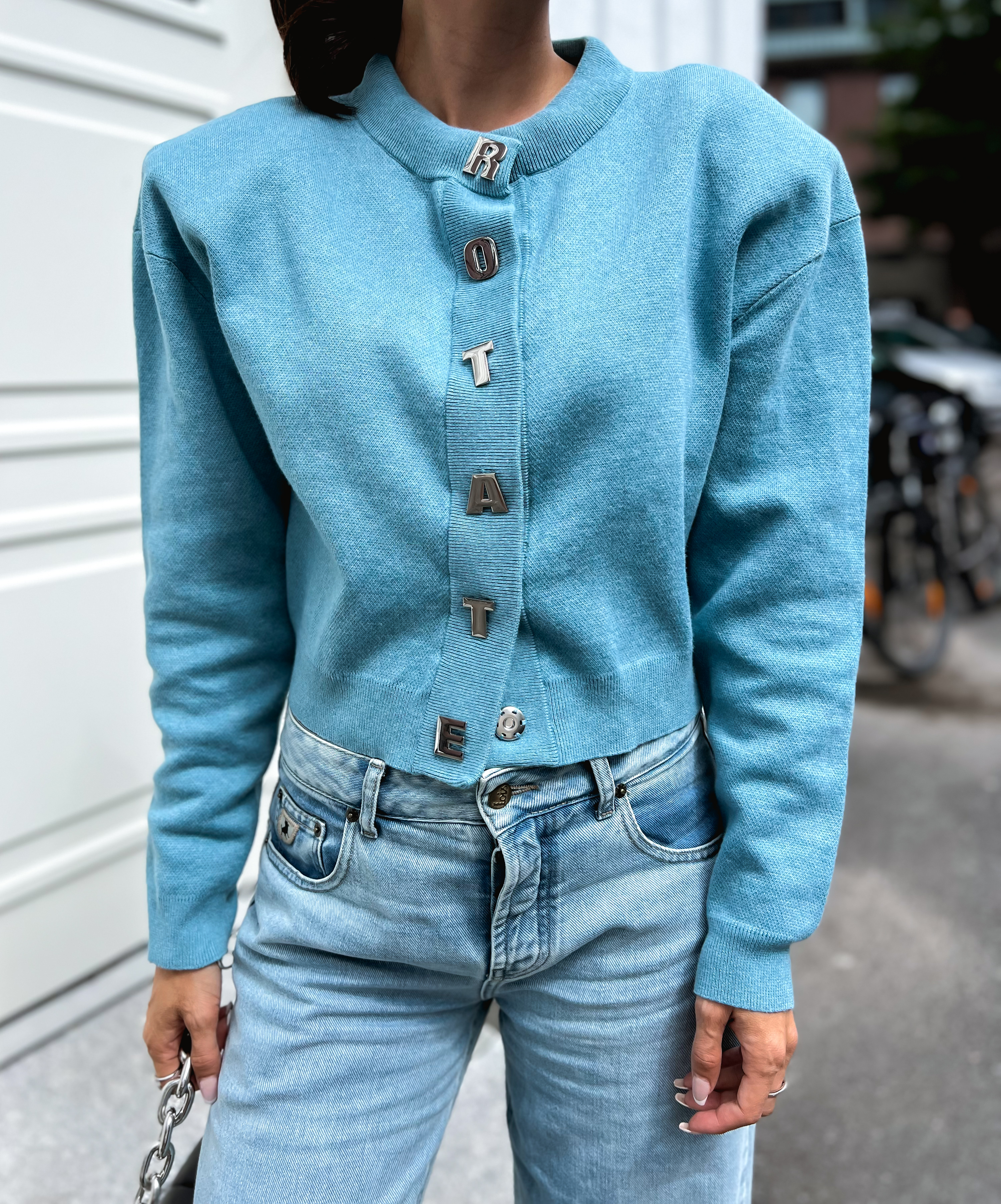 «Firm knit cardigan» fra Rotate. Råkul sort kort cardigan med logo knapper i sølv «Rotate». Cardigan har rund hals og lang erm med store puff skuldre.