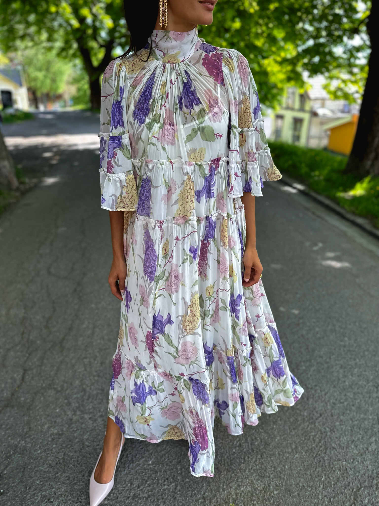 The Chiffon Shift Dress er skåret i enlett gjennomsiktig og luftig, FSC-sertifisert og 100% bærekraftig viskosekvalitet. Den har en maksilengde, høy hals, voluminøs silhuett og trekvart klokkeermer. Den høye halsen er laget av et bånd som kan knytes i den V-formede ryggen. Kjolen er dekket av vakre, plisserte rysjedetaljer. Den leveres med en underkjole og lukkes på siden med glidelås.