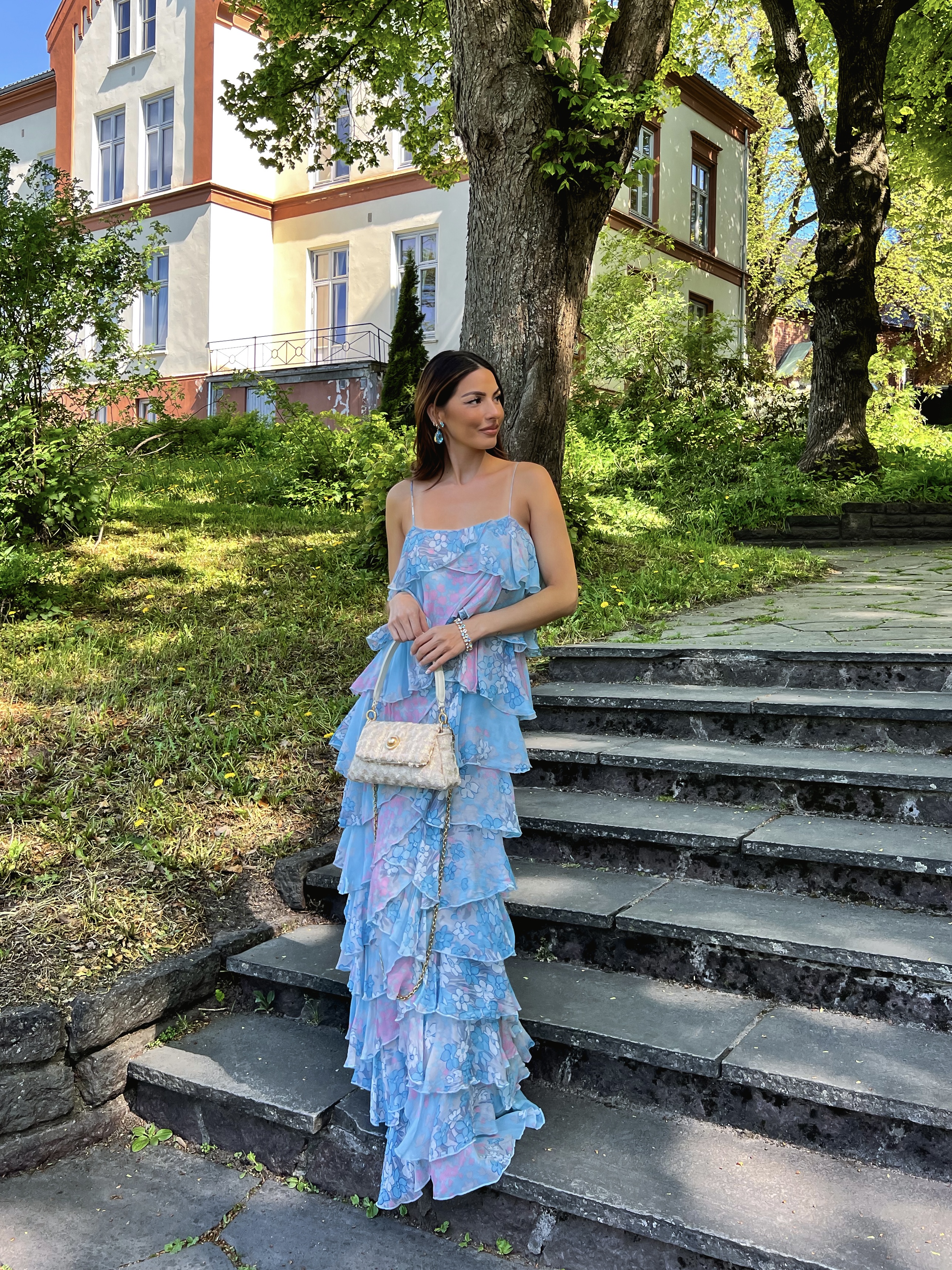 Chiffon Ruffle-kjolen er laget i lett gjennomsiktig og luftig, FSC-sertifisert og 100% bærekraftig viskosekvalitet. Den har maksilengde, en voluminøs silhuett, rund halsringning og tynne stropper over skuldrene. Kjolen er dekket av rysjer, noe som skaper en svært elegant, svevende tiltrekning.