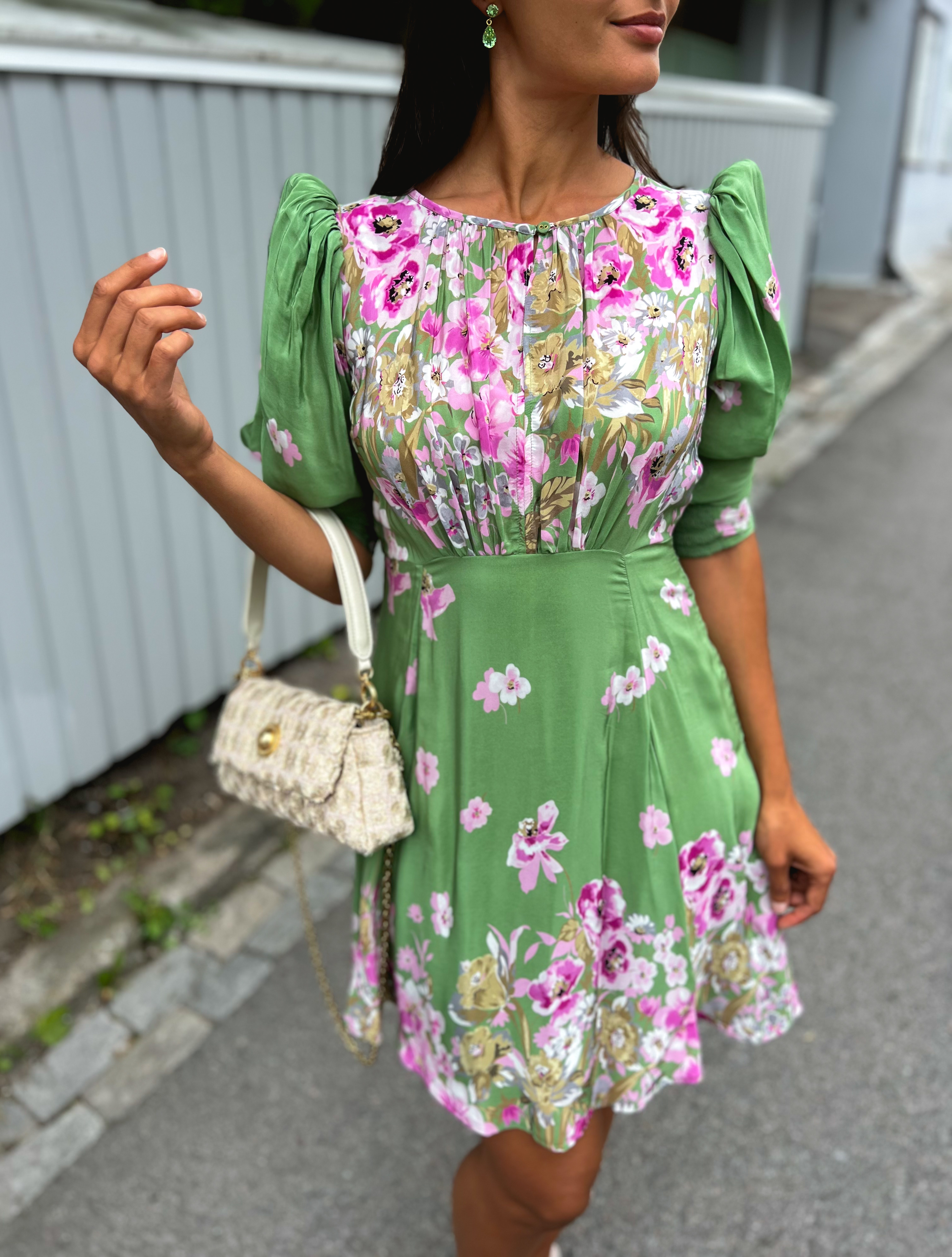Crepe Mini Dress fra byTiMo. Supersøt, kort kjole fra byTiMo. Kjolen har minilengde, tilpasset midje, rund hals med én knapp og korte, puffede ermer med stramme mansjetter. Overdelen og skjørtet har rynkedetaljer og toppen har splitt foran med en knapp som kan festes i halsen. Kjolen lukkes i siden med glidelås.