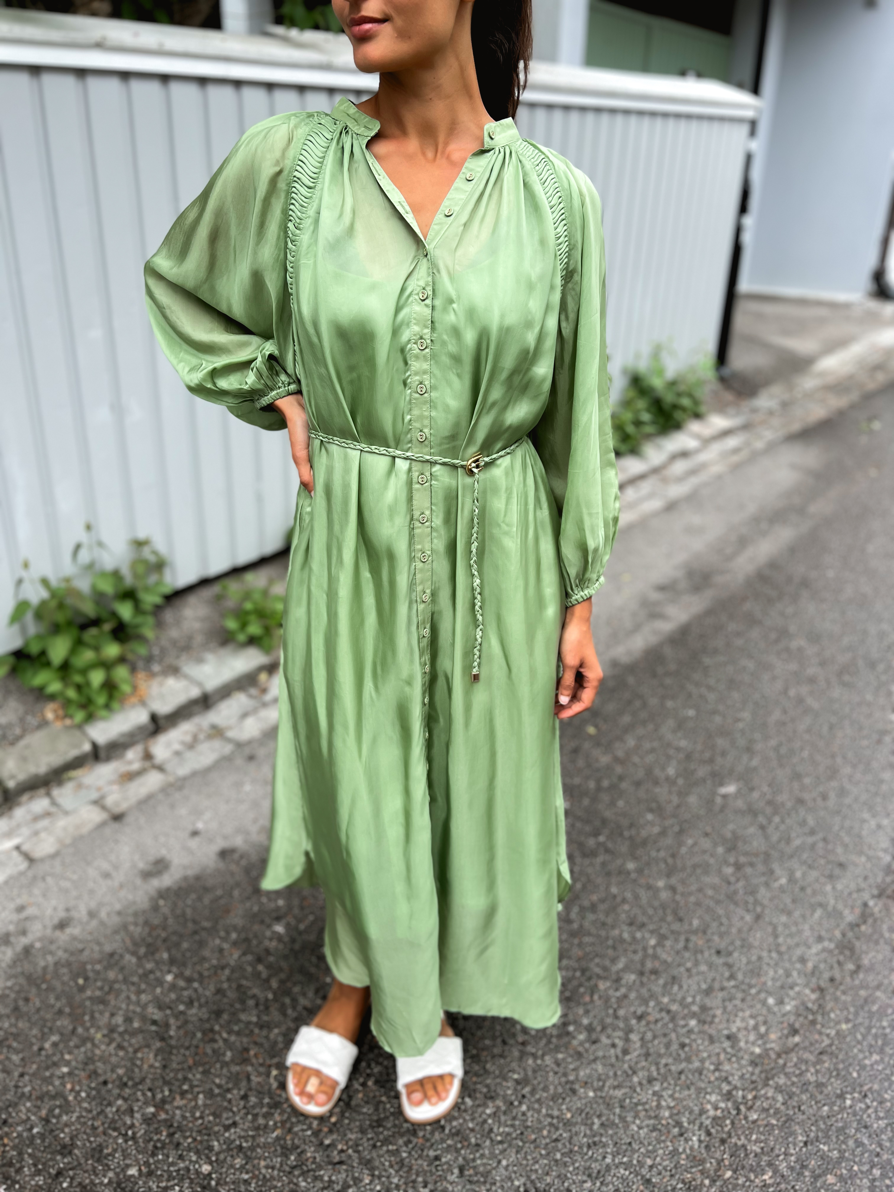 Cupro Halterneck Dress har en lang lengde, en voluminøs passform og en høy hals. Den er ermeløs, men har vakre utskjæringer langs kanten. Kjolen har et løst, matchende bånd.