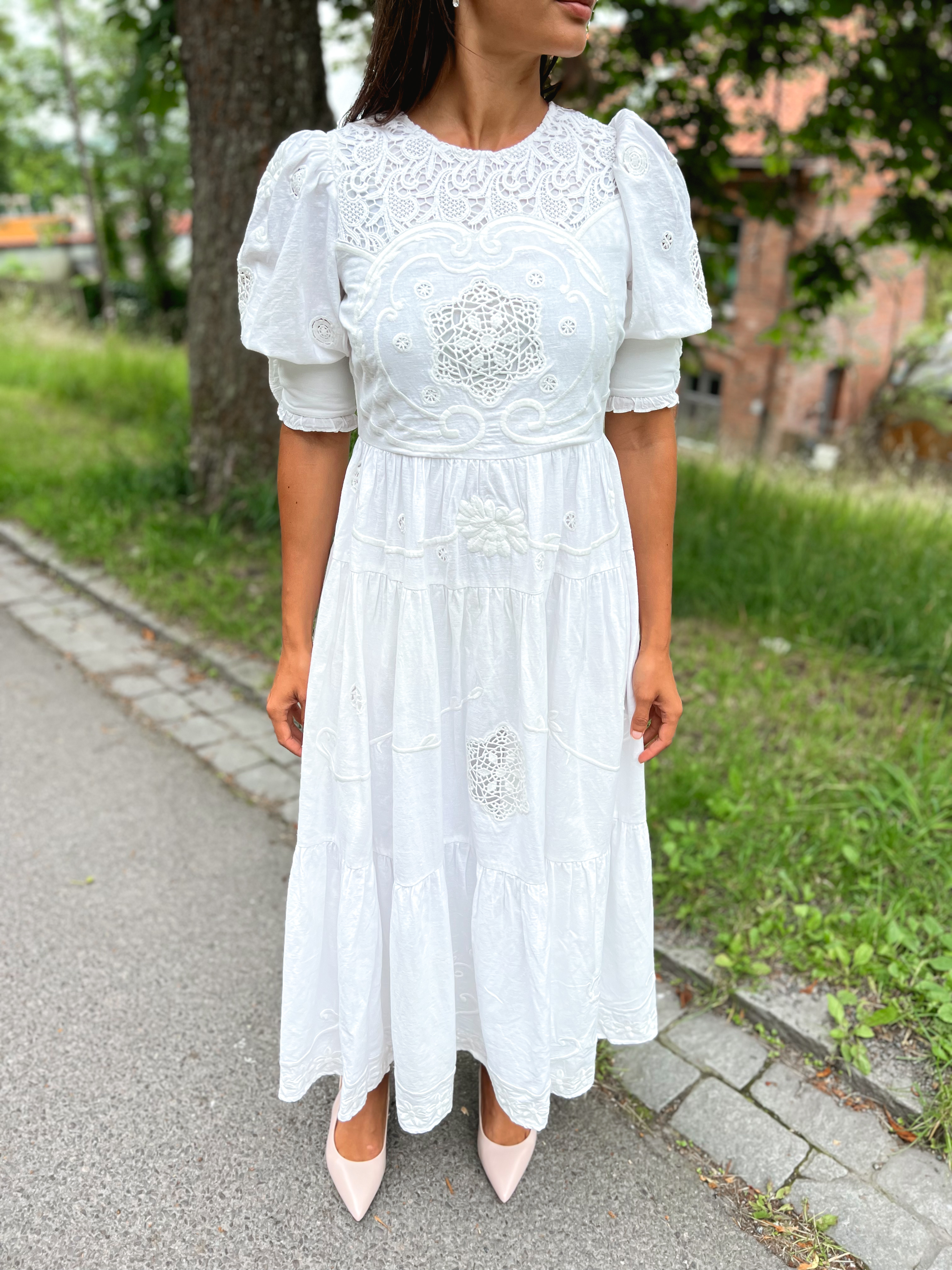"Linen Embroidery Gown" fra byTiMo er laget i en elegant og pustende kvalitet av sertifisert blanding av lin og bomull. Kjolen har en maksilengde, rund krage, tettsittende midje, voluminøst skjørt og korte puffede ermer. De stramme mansjettene er dekorert med knapper og delikate rysjedetaljer på kanten. Den er dekket av svært delikat broderi og broderi-innlegg, og det trappede skjørtet har dype folder som skaper en følelse av volum og bevegelse. Kjolen lukkes på siden med en glidelås. Det er et vakkert stykke håndverk og moderne eleganse.