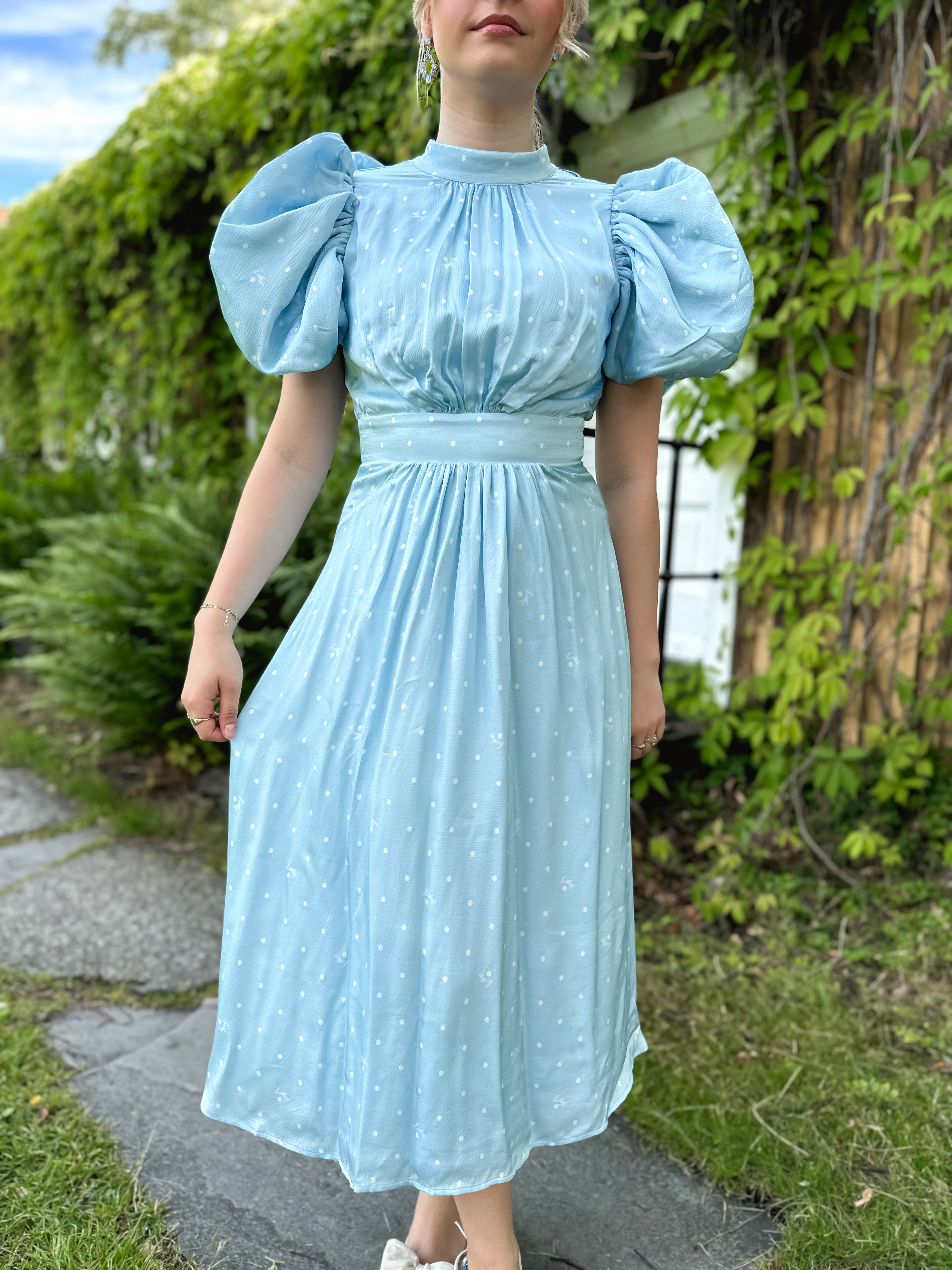 Textured Midi Puffy Dress - Oval Polka Dot + Cool Blue Combo