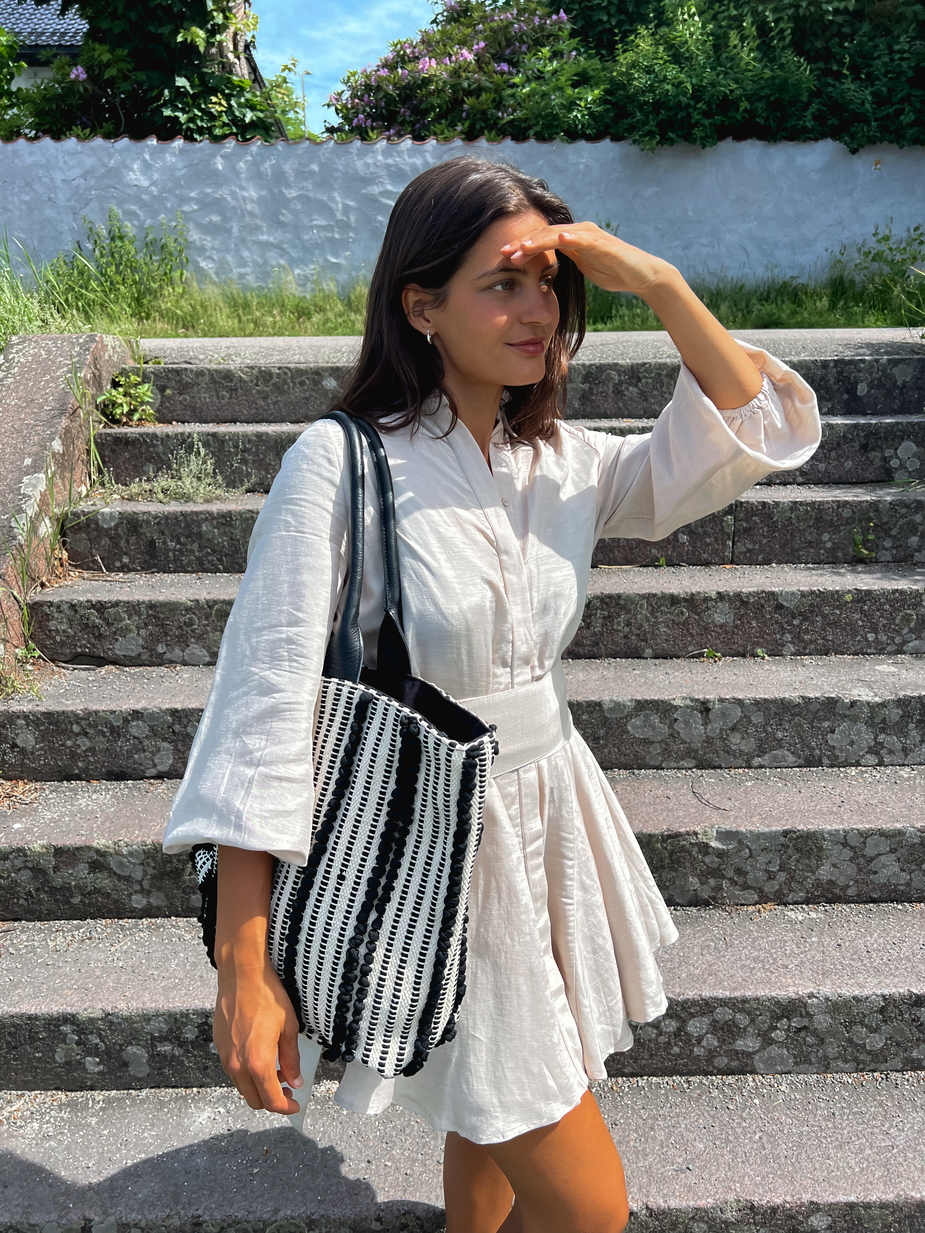 "Bon Weekend Dress" en re-runner av fjorårets superhit, men denne gangen i en ny, herlig linkvalitet. Den har ekstra volum i skjørtet, kombinert med doble lag av tynn bomull. Bruk med eller uten belte, eller helt åpen som en kimono for en personlig vri. Overdelen er som en løs og ledig skjorte, med innsving i midjen og perfekt, struttende skjørt.